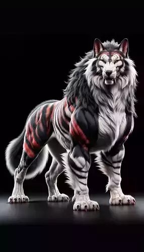 This breathtaking 3D render showcases a mythical hybrid creature, blending the majestic power of a tiger with the wild spirit of a wolf — resulting in a truly unique and awe-inspiring fantasy beast. The creature stands poised on a glossy black surface against a pure black backdrop, its muscular form radiating strength and primal energy. Its fur is a mesmerizing fusion: thick, flowing white and gray mane reminiscent of a lion or dire wolf, contrasted with bold, fiery red-and-black tiger stripes that ripple across its shoulders, flanks, and legs. The face combines feline structure with canine intensity — sharp amber eyes glow with inner fire, while its snout is slightly elongated, revealing subtle fangs and a hint of aggression.