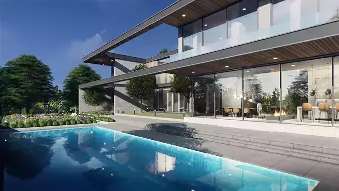 Fully package for of Villa Horizontal for basic archiectural design stage with : the 3D model textured and illuminated outdoor scene, Architecture 2D drawing coordinated with 3D file, Render - exterior / Interior scenes with two different lighting settings (day and night) ready to render with Lumion 10 or higher, and Post-production (10 PSD files).