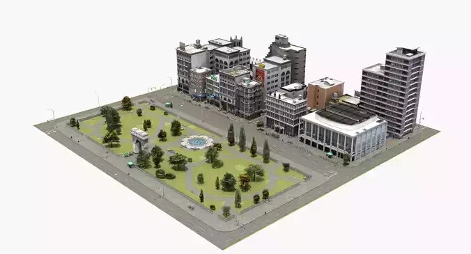 City Park Block. Includes shops, houses, roads, trees, apartment buildings, street furniture, construction and more. Great multipurpose 3D model (ideal for offline rendering or real time uses such as games or simulation).