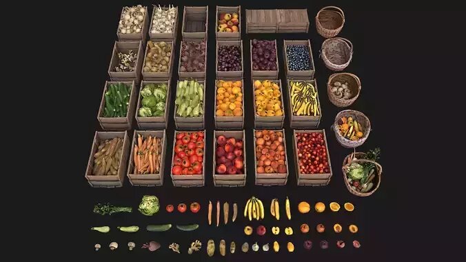 Game ready models.Stylized and detailed Vegetables and Fruits Bazaar Set fully textured, sculpted and rendered with Physical based rendering (PBR) - Shown images have been rendered in Marmoset Toolbag .The models contains lods, detailed information on the images. The set contains 74 models. High Quality textures (PBR).