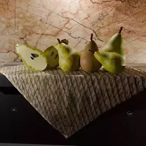 This scene features a realistic cloth simulation gently draped over a set of high-quality 3D pears, created and rendered in Blender using the Cycles engine. The fabric naturally flows over the curves and contours of the pears, showcasing Blender’s powerful cloth physics and providing a visually rich, photorealistic result.